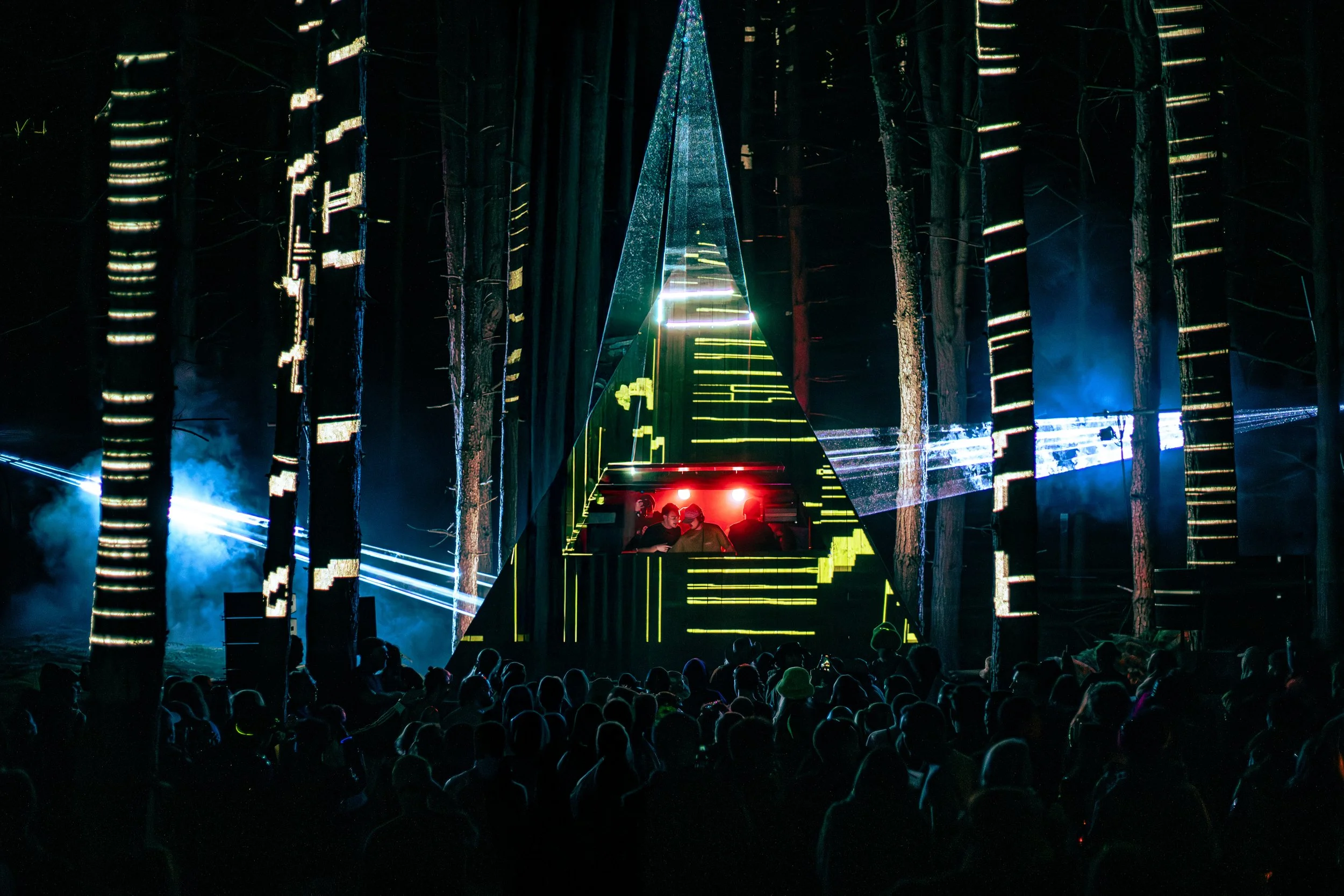 Deep in the forest for Stowaway Festival’s Go West stage, we created a visual and laser experience that brought the forest floor to life. The pyramid DJ booth surrounded by trees became our canvas for light, laser and video, transforming the woodland into a surreal, multi-sensory playground. The visual feast blended projection, live laser performance and immersive light design, all pulsing in sync with the music and energy of the crowd.